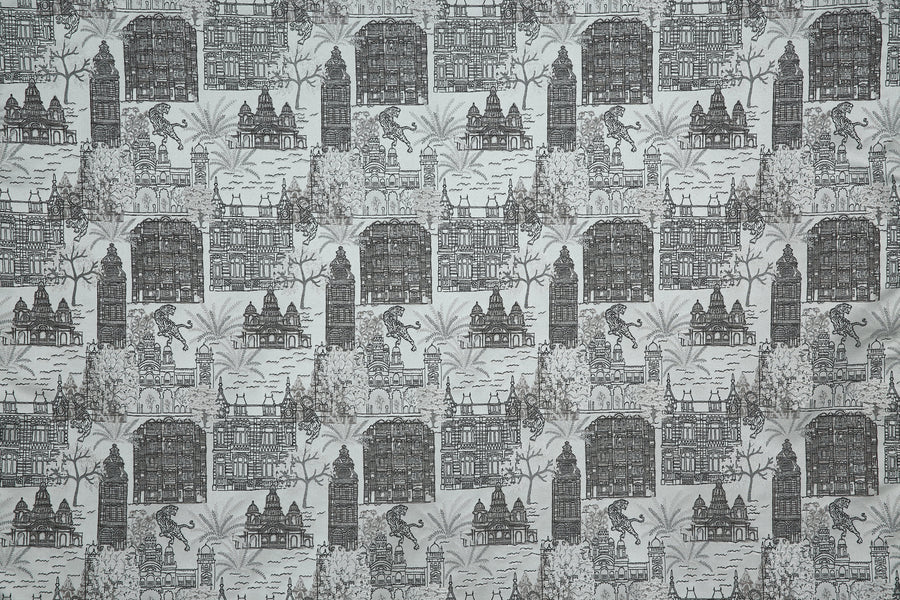 The satin face and course wefts of Wodeyar give an embroidered look to the fabric. Metallic overlays that catch the light and the painstaking detail almost transform it into a landscape with shimmering water and lush trees.